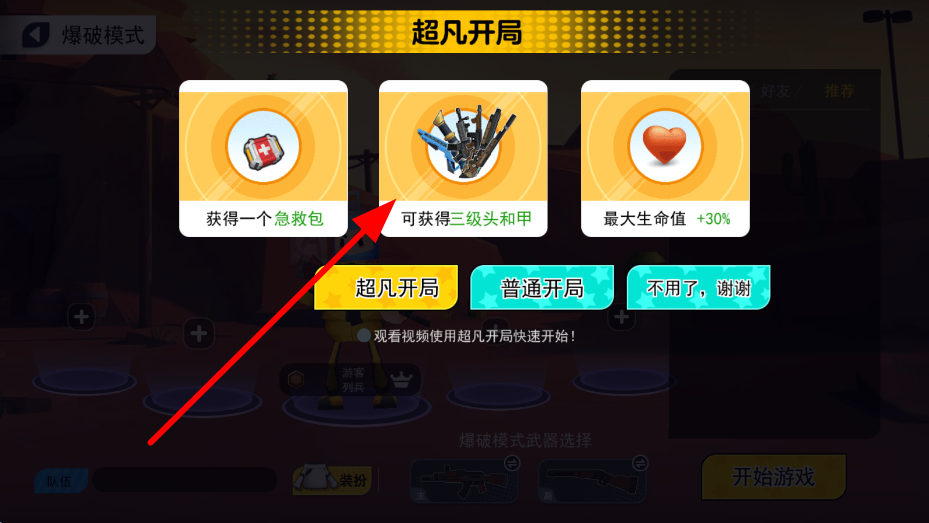 3、開局選擇界面,有超凡開局等選項,其中包含獲得急救包、三級頭和甲等增益,可根據需求選擇,為戰(zhàn)斗開局創(chuàng)造有利條件。