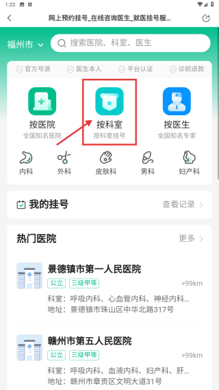 2、在掛號頁面,選擇按科室掛號方式,進入科室選擇界面。