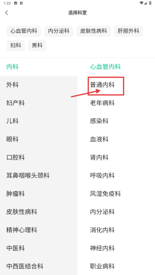 3、在科室選擇頁面,點擊普通內(nèi)科科室,進入對應(yīng)醫(yī)院列表。