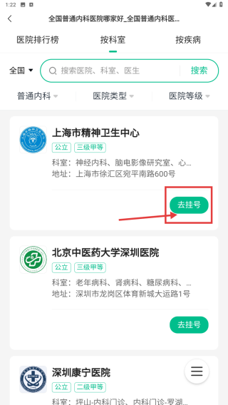 4、在醫(yī)院列表中,選擇目標醫(yī)院,點擊去掛號按鈕,完成掛號操作。