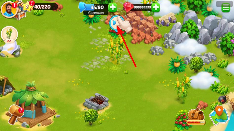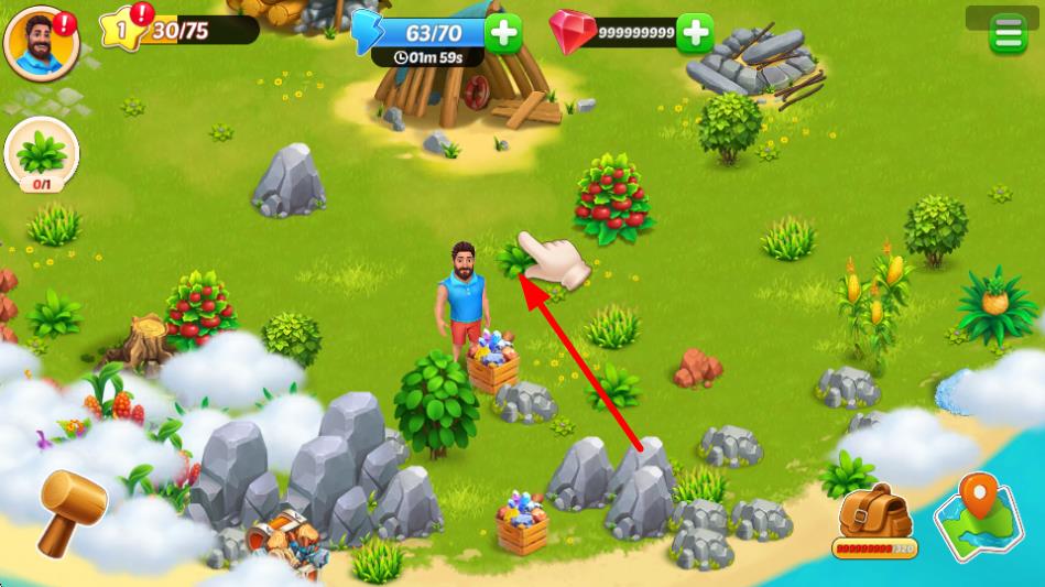 1、在模擬經(jīng)營游戲中,點擊植物可進行收獲操作,這是獲取資源、推進游戲的基礎(chǔ)步驟,界面中的島嶼場景充滿生機。