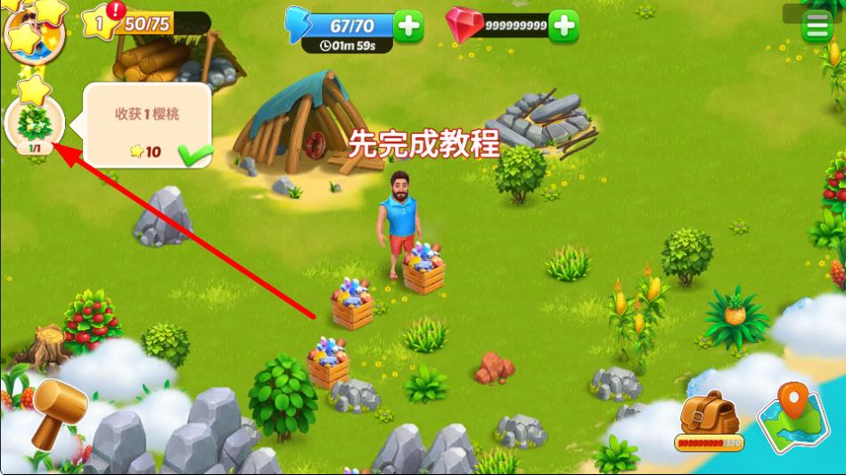 2、收獲櫻桃后完成教程任務(wù),獲得星星獎勵,教程任務(wù)幫助玩家熟悉游戲操作和機制,用于解鎖新功能或提升建筑等級。