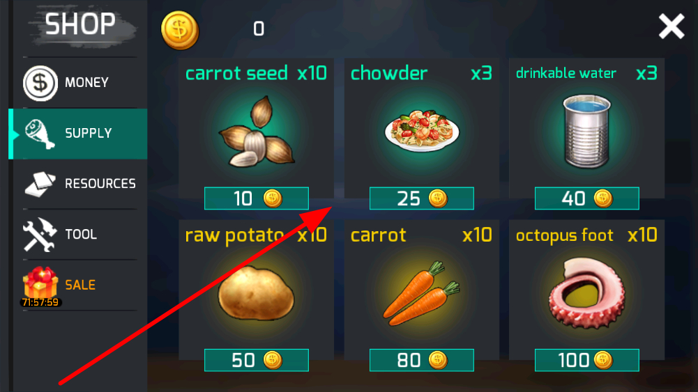 3、進入商店界面,可使用金幣購買各類補給,像食物、水源等,根據(jù)自身的需求與金幣數(shù)量,挑選合適的補給品,為生存提供保障。