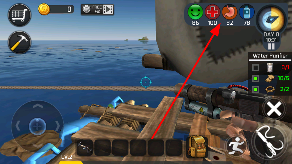 4、時刻關注自身的健康、飽腹、飲水等生存狀態(tài),當相關狀態(tài)數(shù)值降低時,及時使用對應的補給來恢復,確保能在海上持續(xù)生存下去。