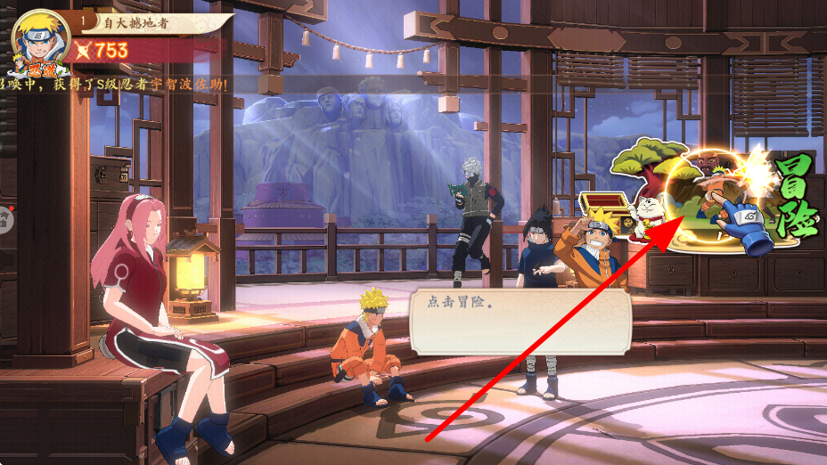1、新人玩家在游戲的主界面,點擊冒險按鈕,即可進入冒險模式,開啟在火影世界的探索之旅,迎接各類戰(zhàn)斗與挑戰(zhàn)。