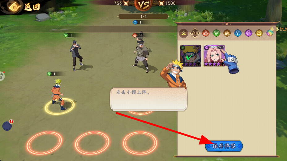 2、進入戰(zhàn)斗準備界面,可選擇合適的忍者上陣,搭配出契合當前戰(zhàn)斗的陣容,之后點擊保存陣容,確定上陣的忍者組合。