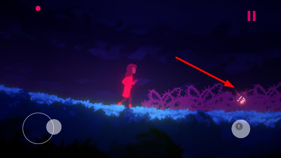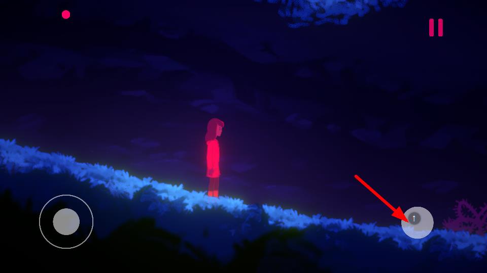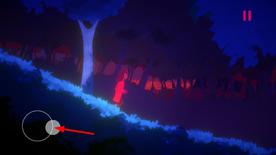 1、在冒險解謎游戲中,操控角色在夜晚的森林場景中移動,按鈕用于控制角色的行走方向,暗色效果營造神秘冒險氛圍。