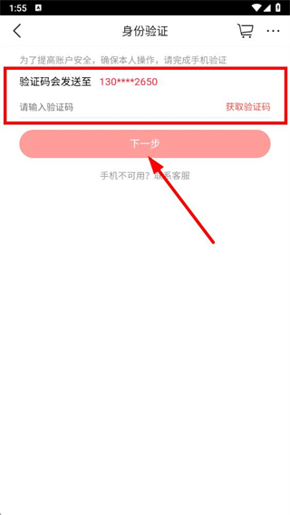 5、接著在身份驗(yàn)證頁面獲取并輸入原手機(jī)號的驗(yàn)證碼,點(diǎn)擊下一步,按照提示完成新手機(jī)號的綁定。