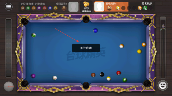 2、完成瞄準(zhǔn)后擊打主球,使主球撞擊彩球,若對(duì)局中有加注環(huán)節(jié),成功加注后會(huì)出現(xiàn)“加注成功”的提示,此時(shí)繼續(xù)關(guān)注臺(tái)球桌上球的運(yùn)動(dòng)軌跡,準(zhǔn)備后續(xù)擊球。