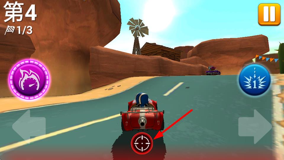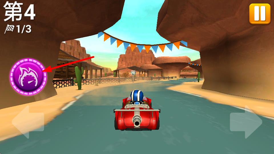 1、點(diǎn)擊左側(cè)紫色加速技能按鍵,可觸發(fā)車輛加速效果,在比賽中快速提升車速,搶占優(yōu)勢位置。