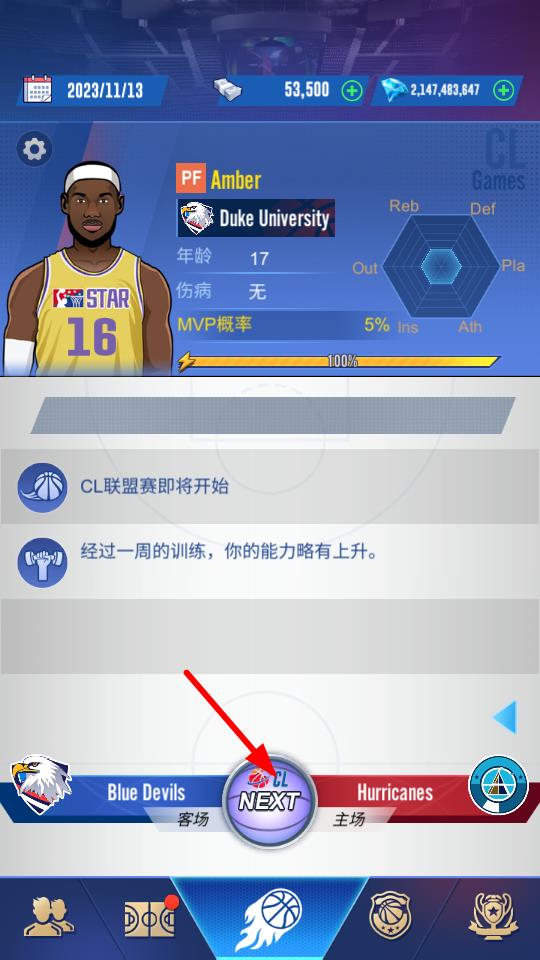 1、點擊NEXT按鍵,可推進游戲進程,進入下一場CL聯(lián)盟賽,參與的賽事獲取獎勵與經(jīng)驗。