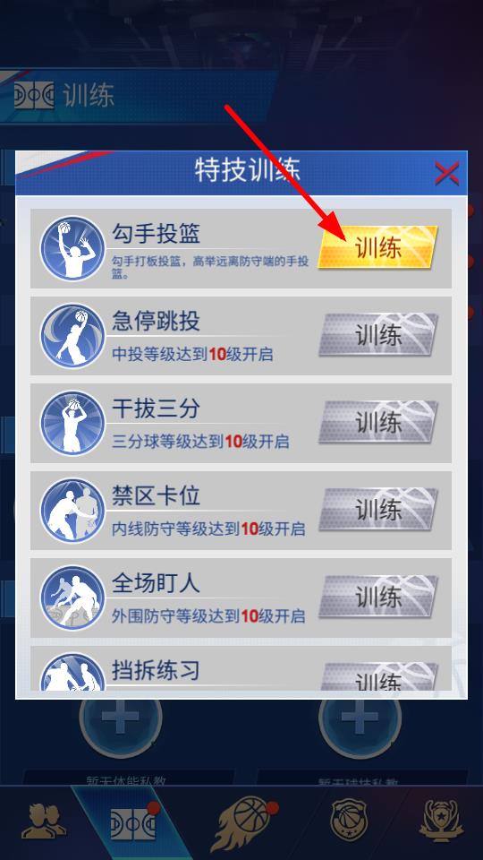 2、在特技訓練界面,點擊訓練按鍵可進行勾手投籃訓練,提升技能水平,增強得分的能力。