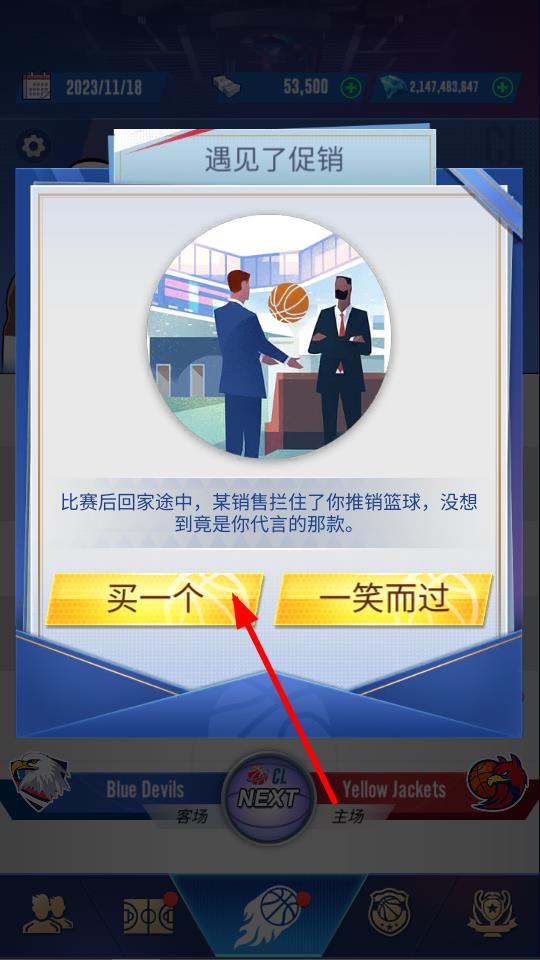 3、遇到促銷事件時,點擊買一個可獲取代言的籃球道具,助力球員訓練或比賽,提升體驗。