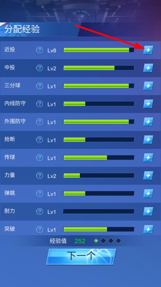 4、在分配經(jīng)驗界面,點擊近投右側(cè)的+按鍵,可將經(jīng)驗分配給近投屬性,提升球員近投能力。