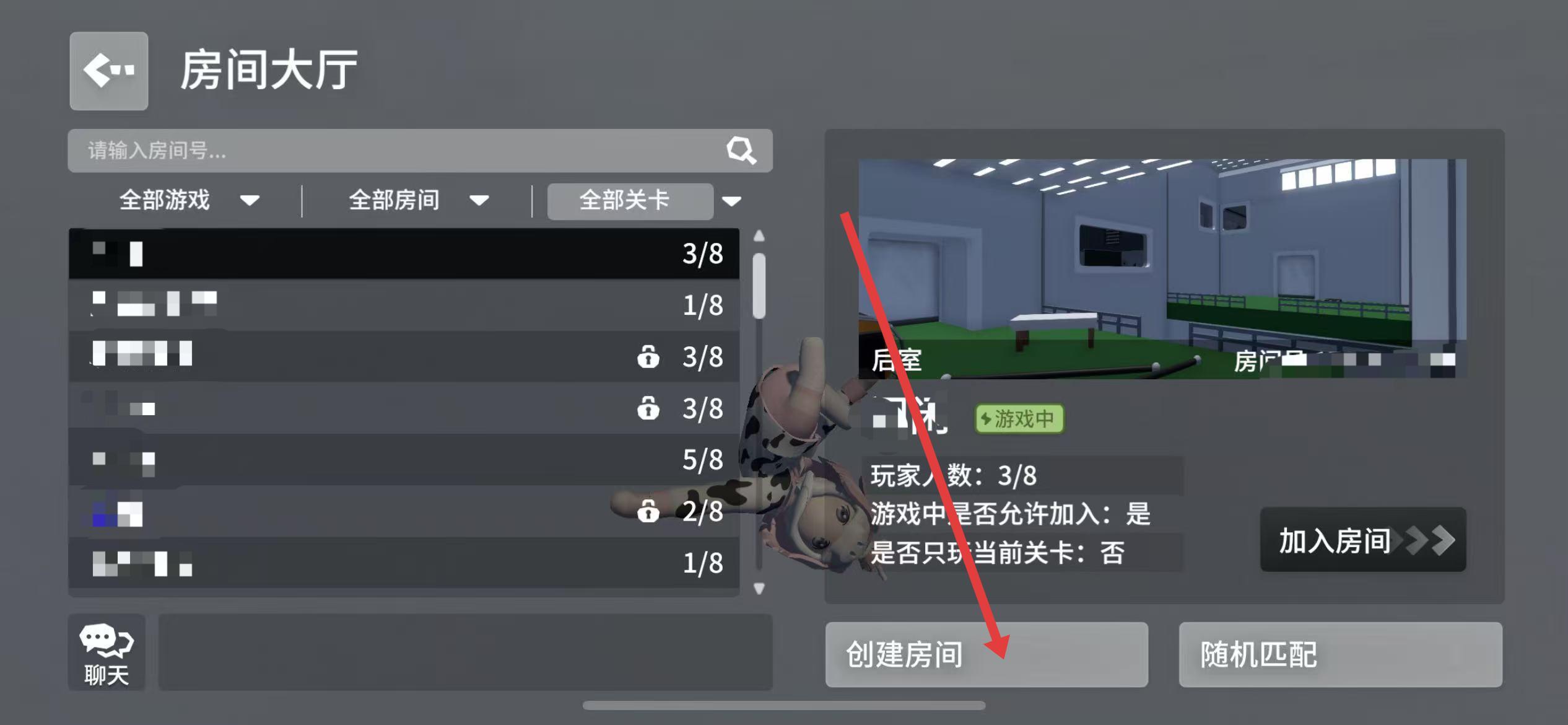 3、點(diǎn)擊組隊(duì)模式后來(lái)到房間大廳,有創(chuàng)建房間和隨機(jī)匹配按鈕,選擇并點(diǎn)擊創(chuàng)建房間按鈕。