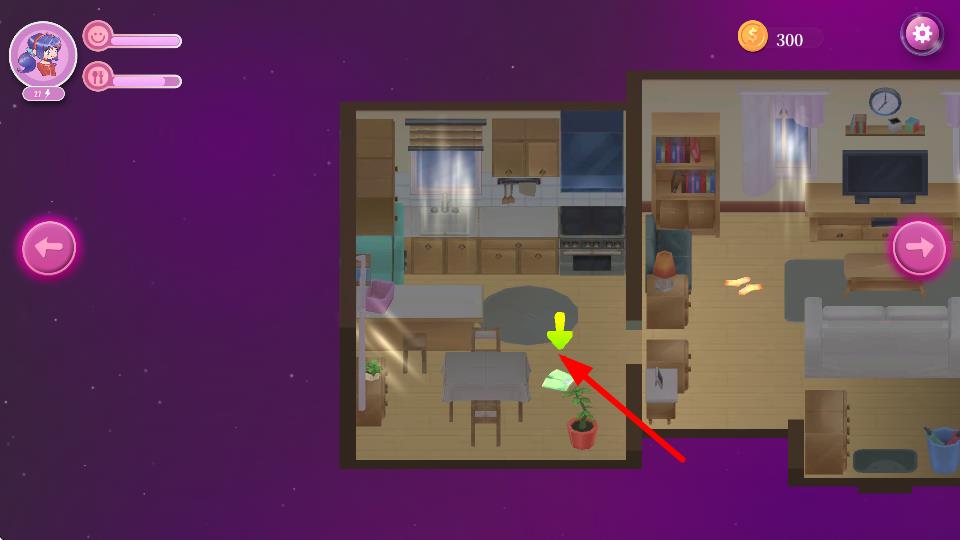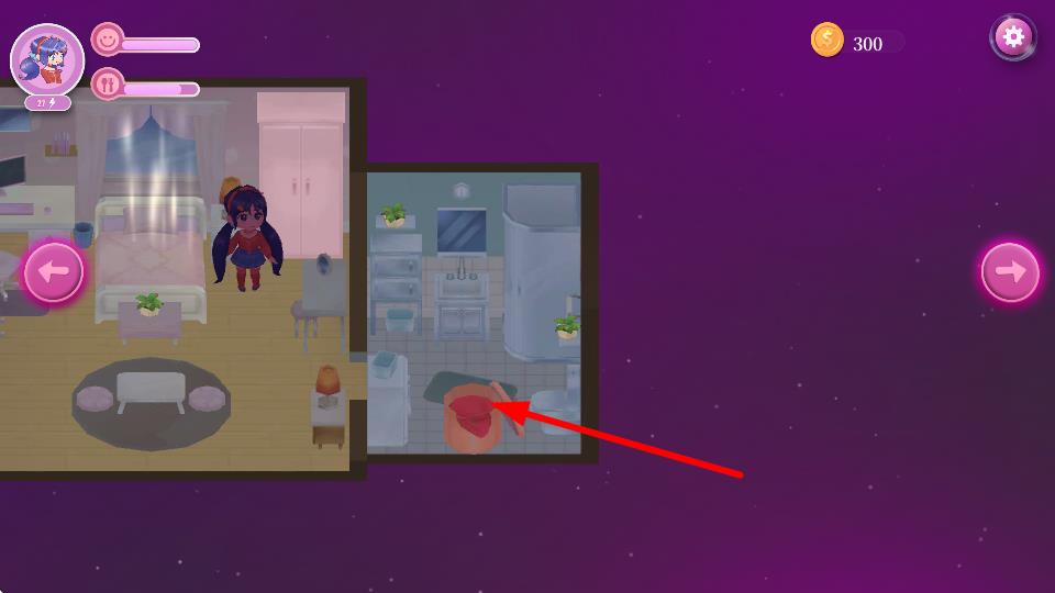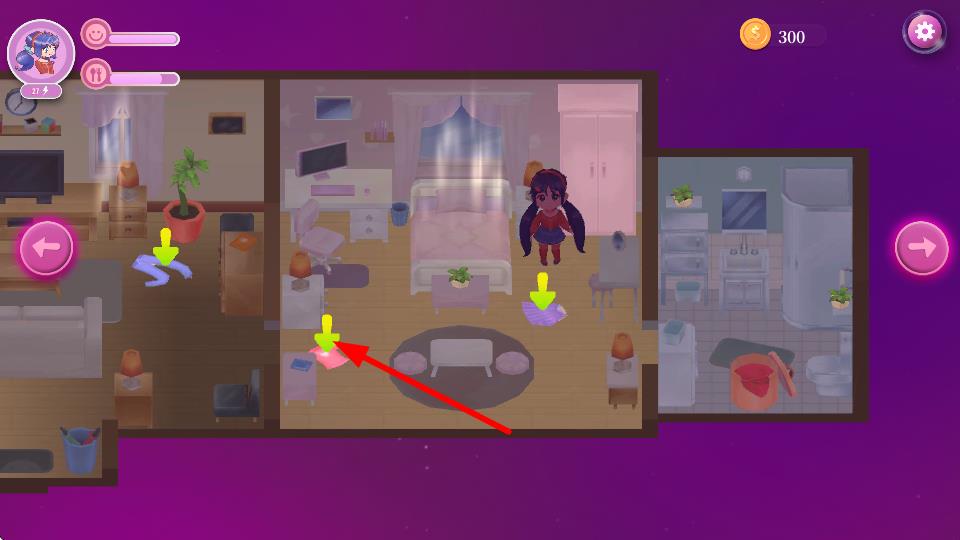 1、在房間場(chǎng)景中,點(diǎn)擊箭頭指向的粉色物品區(qū)域,物品進(jìn)行整理或清潔操作,提升房間整潔度。