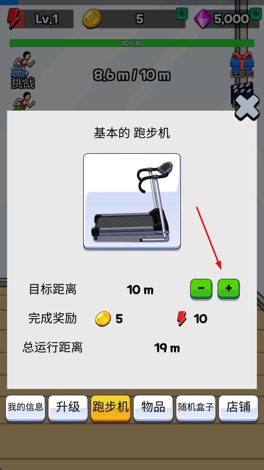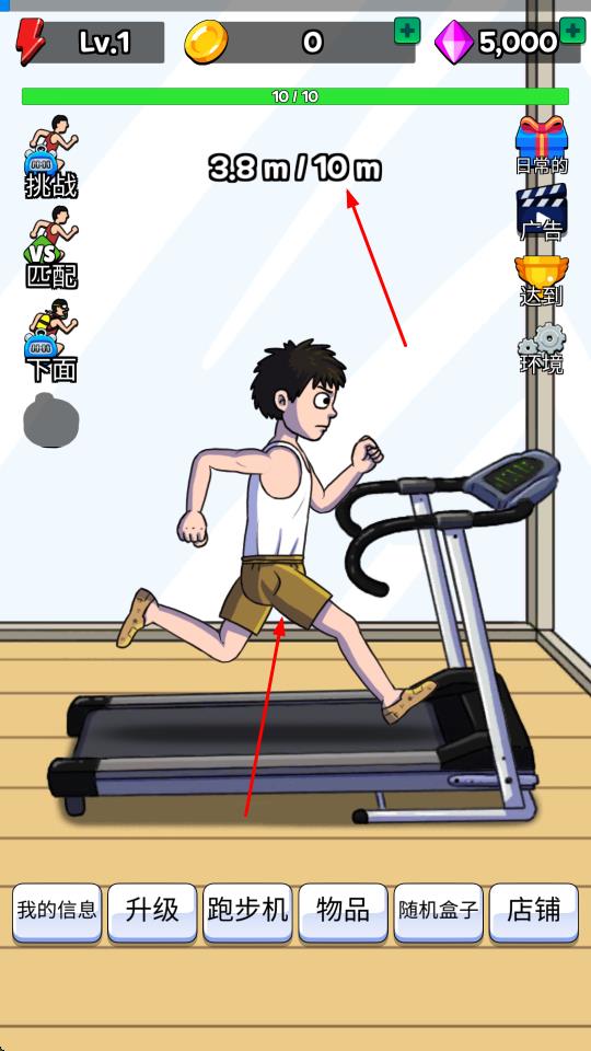 1、操控角色在跑步機(jī)上跑步,屏幕會(huì)顯示當(dāng)前跑步距離與目標(biāo)距離,努力朝著目標(biāo)距離邁進(jìn)。