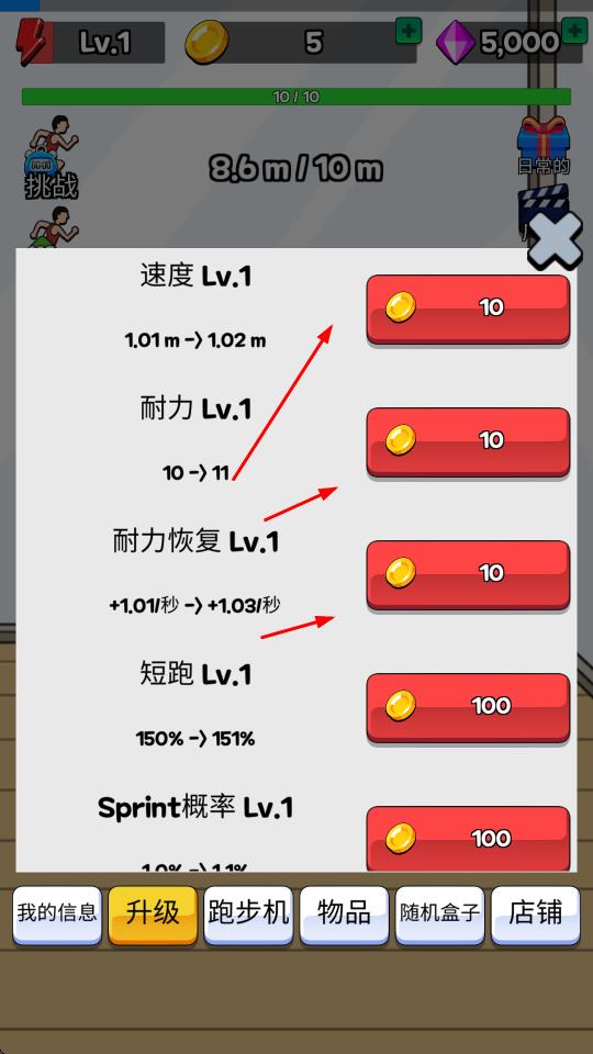3、在升級(jí)界面,花費(fèi)金幣可提升速度、耐力、耐力恢復(fù)等屬性,讓角色跑步能力更強(qiáng),更輕松完成跑步任務(wù)。