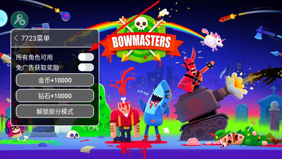 1、在游戲菜單界面,可根據(jù)需求開啟所有角色可用免廣告獲取獎勵功能,還能領取金幣、獎勵及解鎖部分模式。