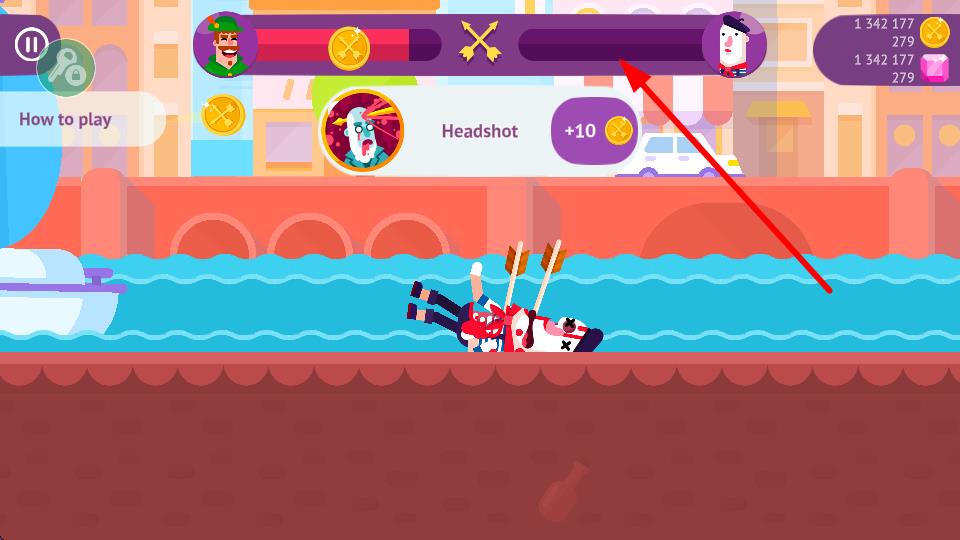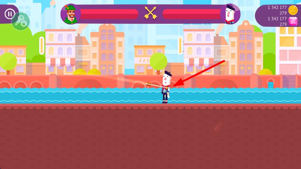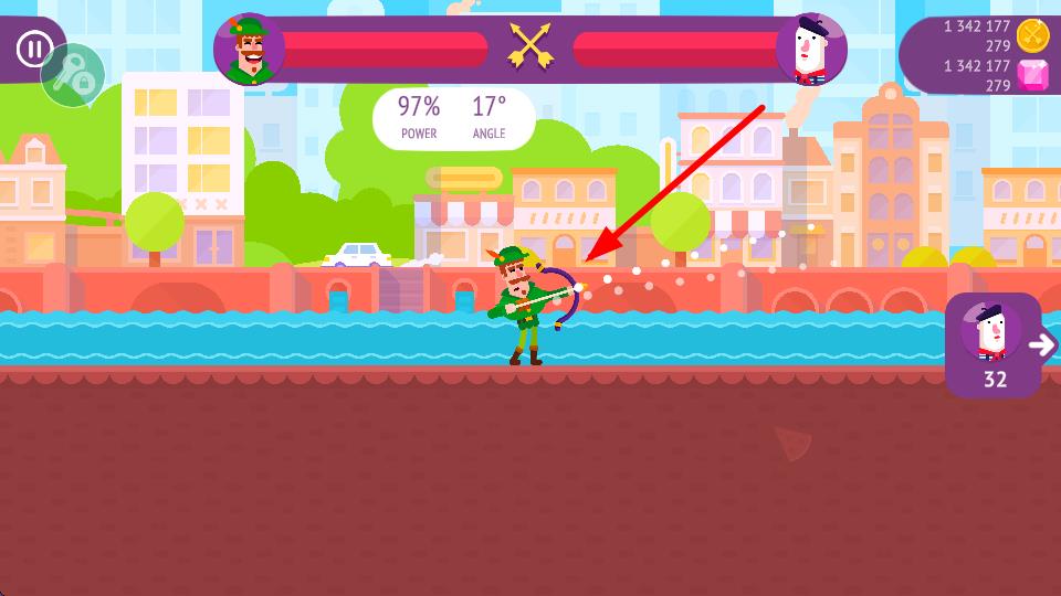 2、戰(zhàn)斗時,操控角色調(diào)整弓箭的力度和角度,按照箭頭指引發(fā)射弓箭,攻擊對手,精準把控力度角度提高命中。