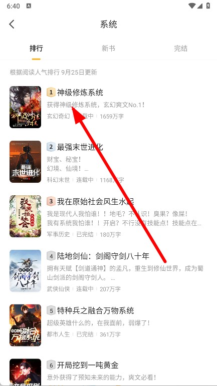 3、進入所選類型的小說列表頁面,選擇想要閱讀的小說并點擊。