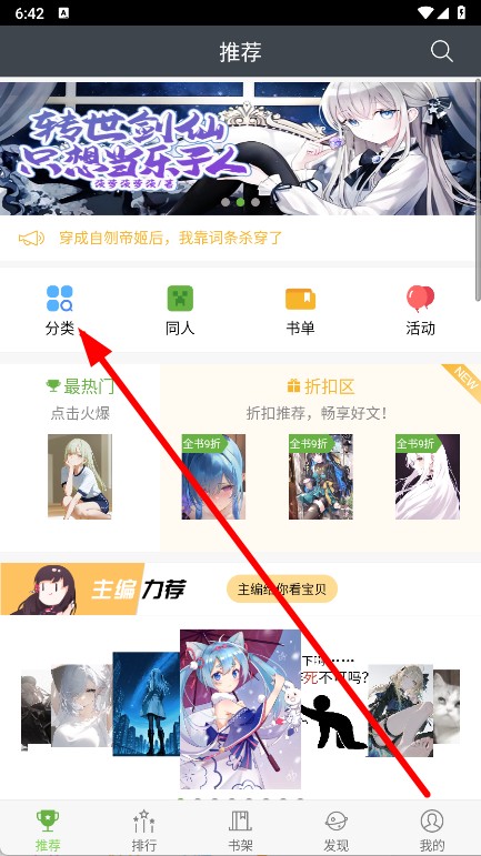 1、打開歡樂書客,在推薦頁面點擊分類。