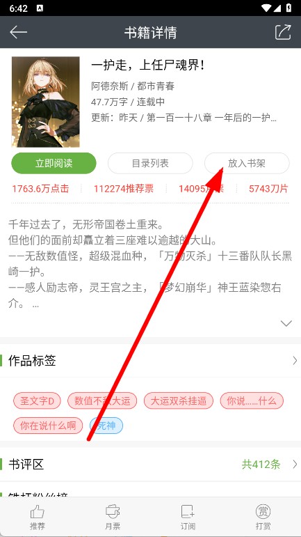 4、進入書籍詳情頁面后,點擊放入書架,在書架頁面找到該小說進行閱讀。