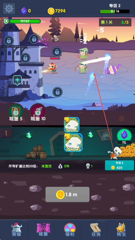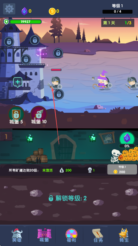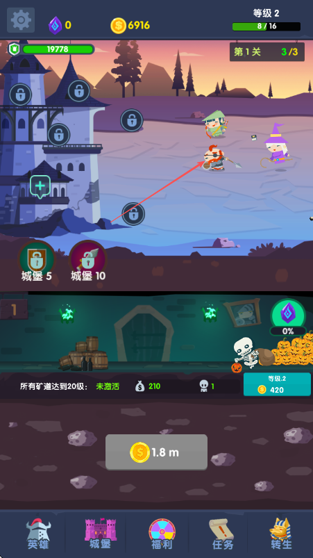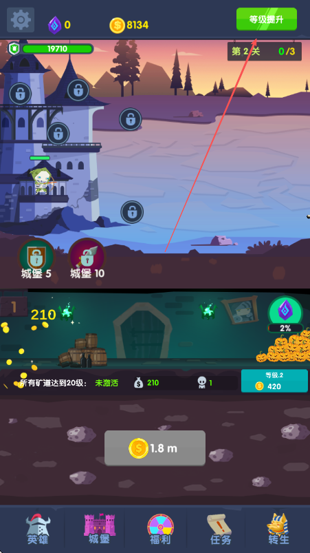 2、隨著關卡推進,積累金幣資源,達到等級2后,按箭頭指引解鎖新的英雄或建筑。