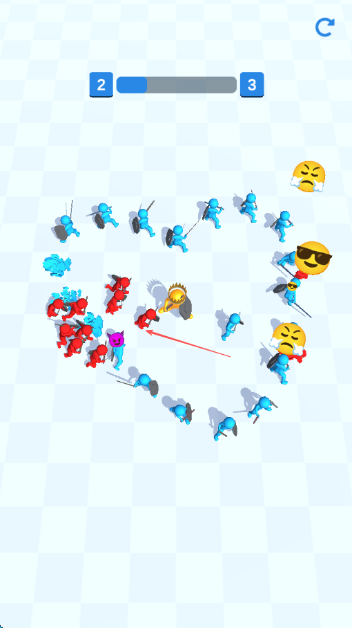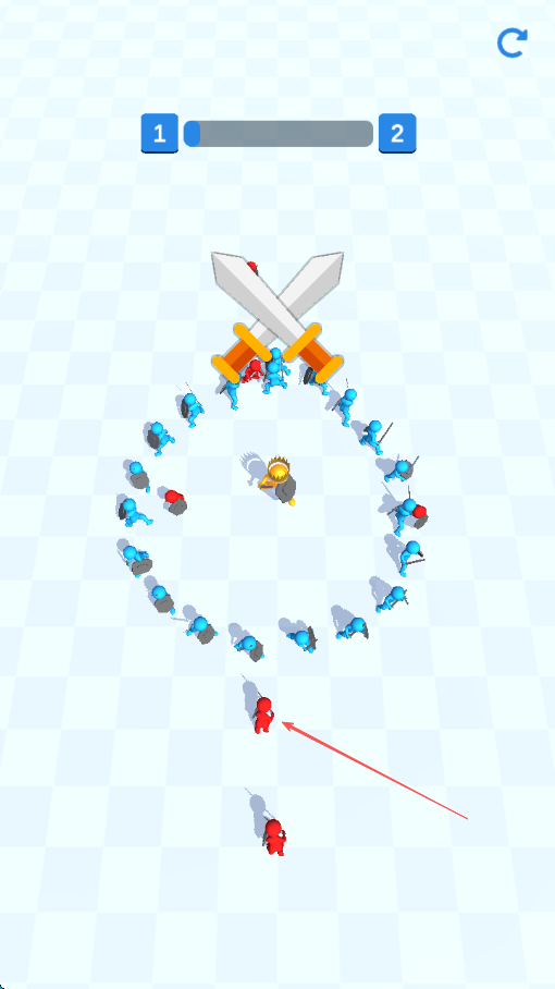 1、游戲開始,觀察進度條,按箭頭方向操控紅色士兵靠近被藍色士兵包圍的金色將軍。