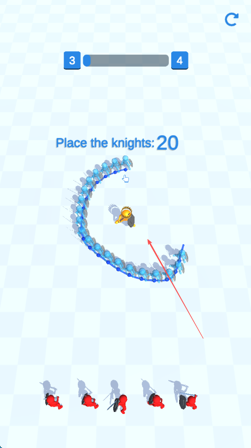 3、依據(jù)Placetheknights20的提示,按箭頭指引合理布置藍色士兵的位置,增強己方陣營實力。