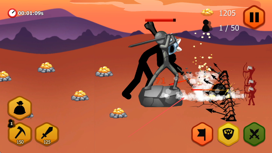 4、操控火柴人,借助防御設(shè)施,合力攻擊強(qiáng)力敵人,擊敗后獲取金幣獎勵。