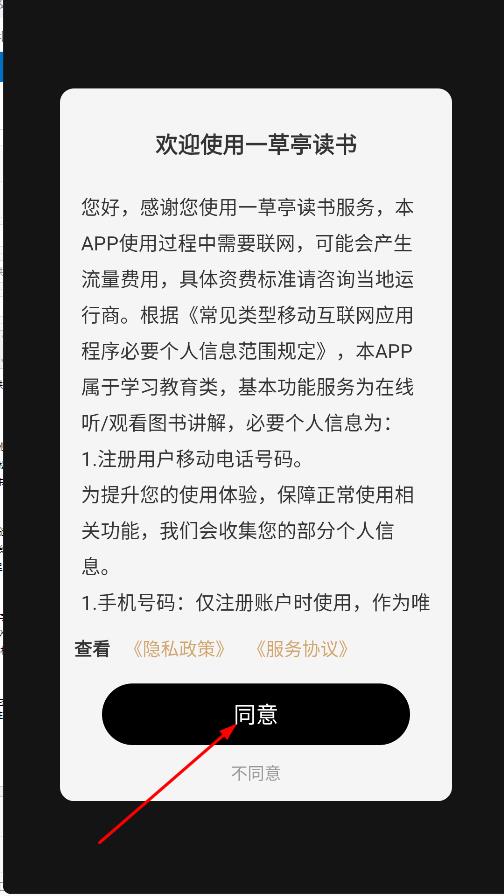 1、在歡迎使用一草亭讀書彈窗中,點擊同意,進入主頁面。