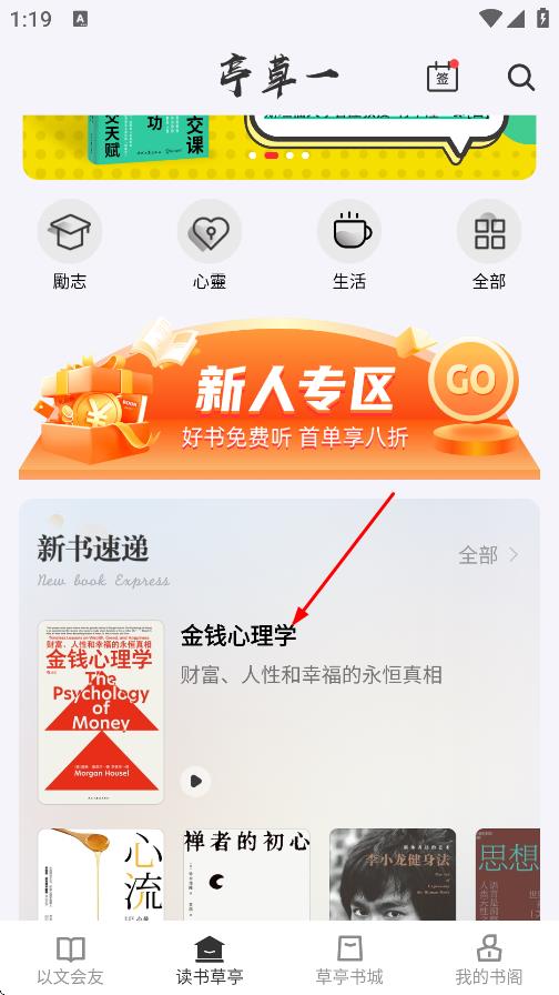 3、在讀書草亭頁面,選擇要收聽的書籍,進入書籍音頻頁面。
