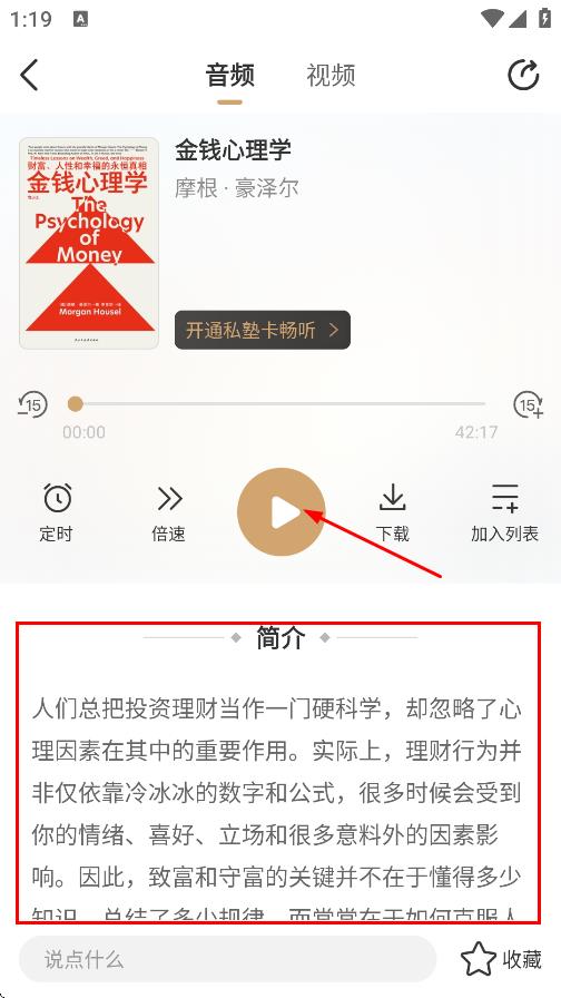 4、在書籍音頻頁面,點擊播放按鈕,開始收聽音頻內(nèi)容。