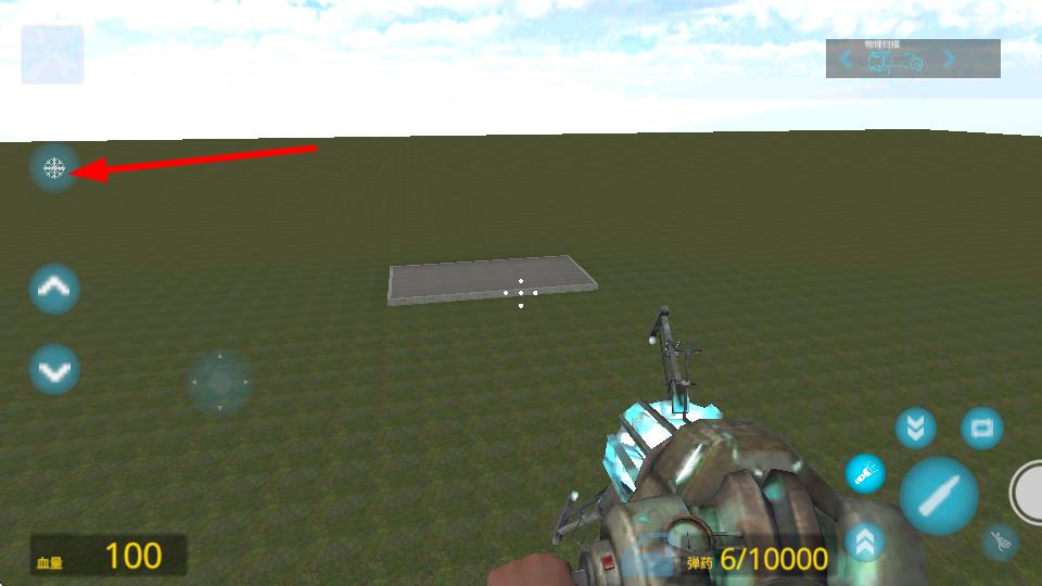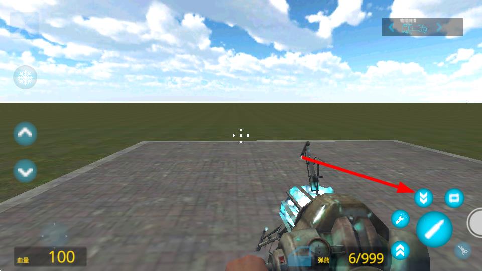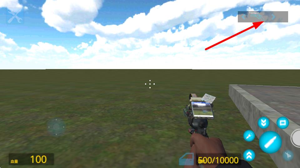 1、點(diǎn)擊右側(cè)箭頭指向的按鍵,可切換武器或工具,適應(yīng)游戲場景和操作需求,攻擊、建造等。