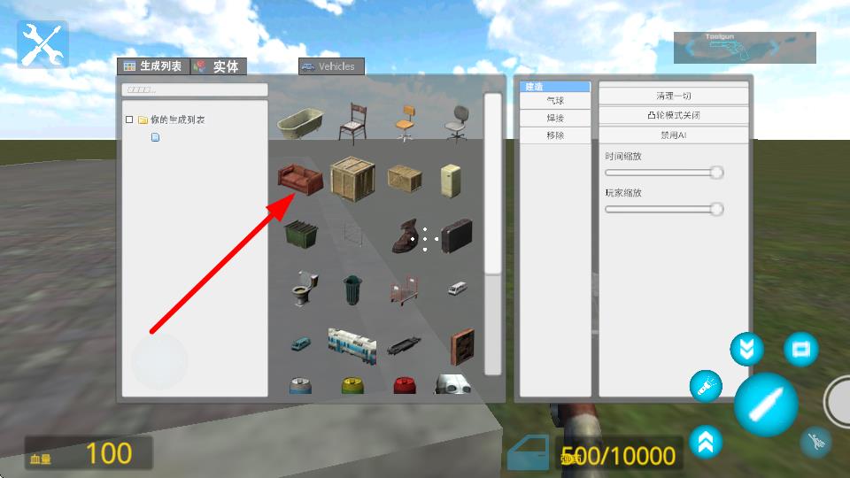 3、選擇箭頭指向的沙發(fā)道具,可在場景中生成沙發(fā),用于建造或裝飾,豐富游戲內(nèi)的場景布置。