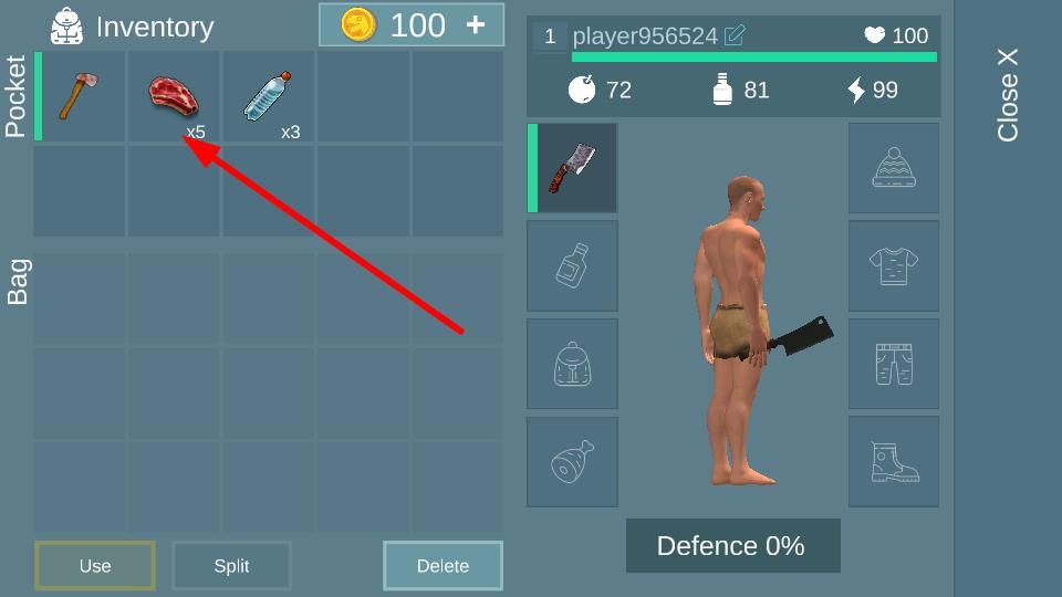3、在inventory界面中,點(diǎn)擊箭頭指向的生肉,可查看或使用該資源,生肉可用于補(bǔ)充饑餓值。