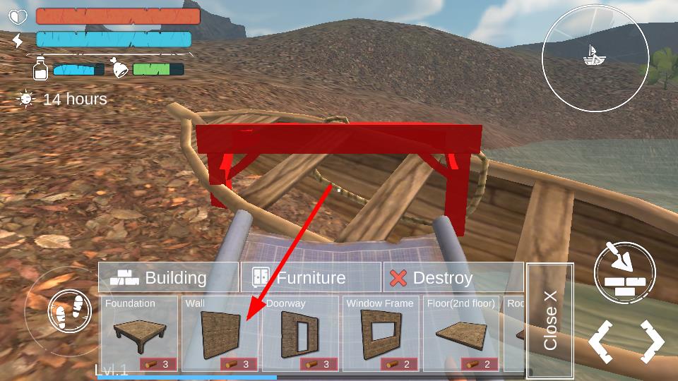 4、在建筑界面中,選擇箭頭指向的墻建筑模塊,場(chǎng)景中建造墻體,用于搭建房屋,提升生存保障。