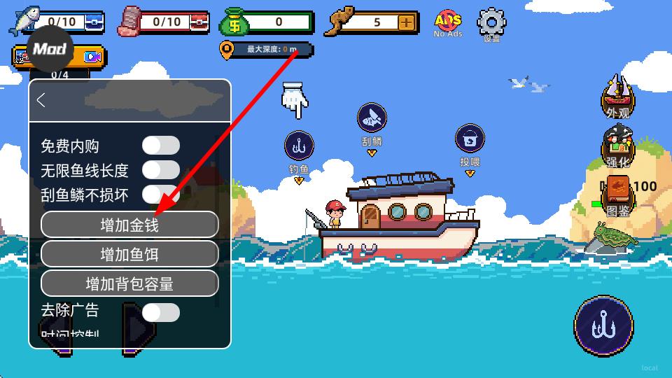 1、點(diǎn)擊增加金錢(qián)按鈕,可獲取游戲內(nèi)金錢(qián)資源,用于購(gòu)買(mǎi)釣魚(yú)裝備、升級(jí)船只等,助力釣魚(yú)事業(yè)發(fā)展。
