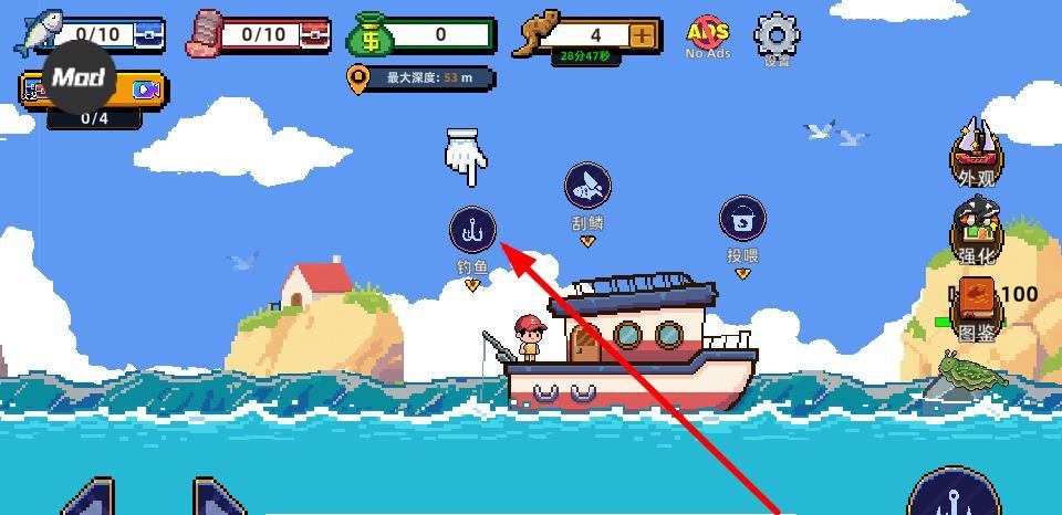 2、點(diǎn)擊釣魚(yú)選項(xiàng),可開(kāi)始釣魚(yú)操作,將魚(yú)鉤放入水中,等待魚(yú)兒上鉤,這是獲取魚(yú)類(lèi)資源的主要方式。