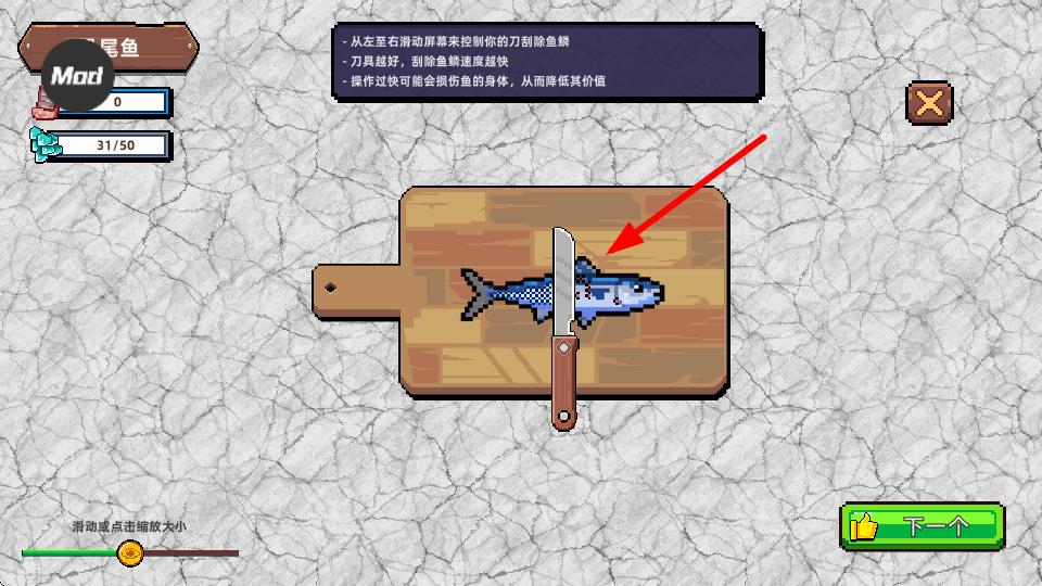 3、按照提示從左至右滑動(dòng)屏幕,控制刀具刮除魚(yú)鱗,刀具越好刮鱗速度越快,避免損傷魚(yú)身降低其價(jià)值。
