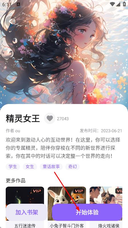 3、在精靈女王作品詳情頁(yè)面,點(diǎn)擊開始體驗(yàn),進(jìn)入互動(dòng)故事頁(yè)面。