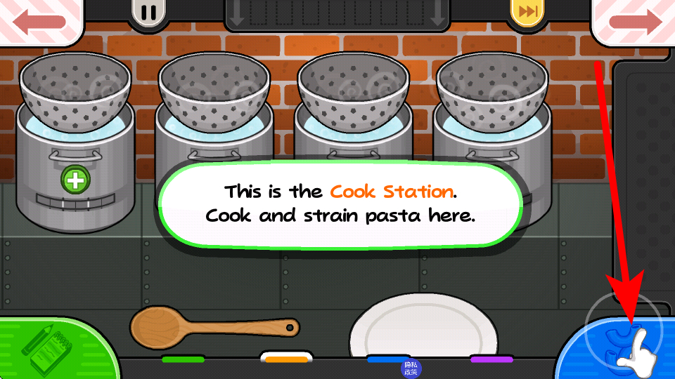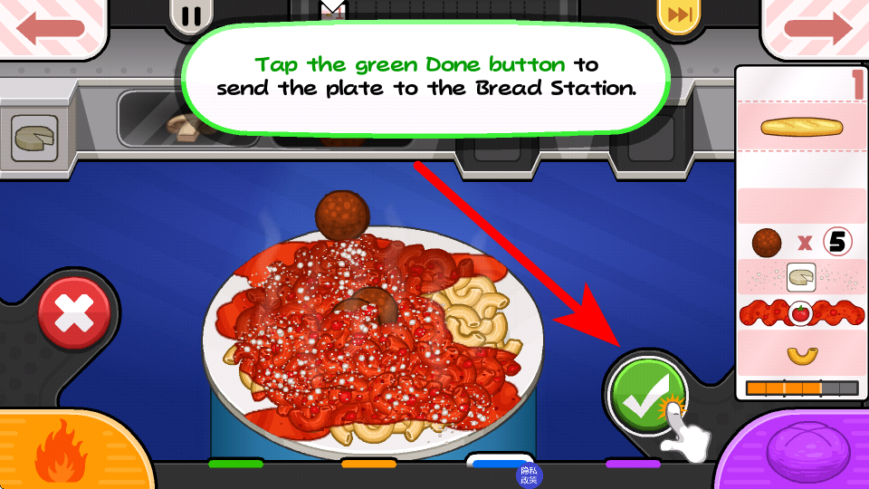 4、意大利面制作完成后,點(diǎn)擊綠色的完成按鈕,把裝有意大利面的盤子送到面包站,完成整個(gè)制作和傳遞的流程,讓顧客能盡快享用到美食。