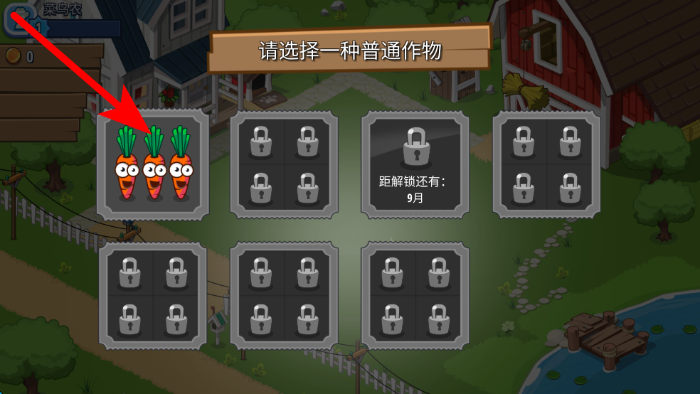 2、土地解鎖后,會(huì)出現(xiàn)選擇作物的界面,可挑選一種普通作物,比如胡蘿卜,選定后就能在土地上進(jìn)行種植,讓農(nóng)場(chǎng)有作物生長。