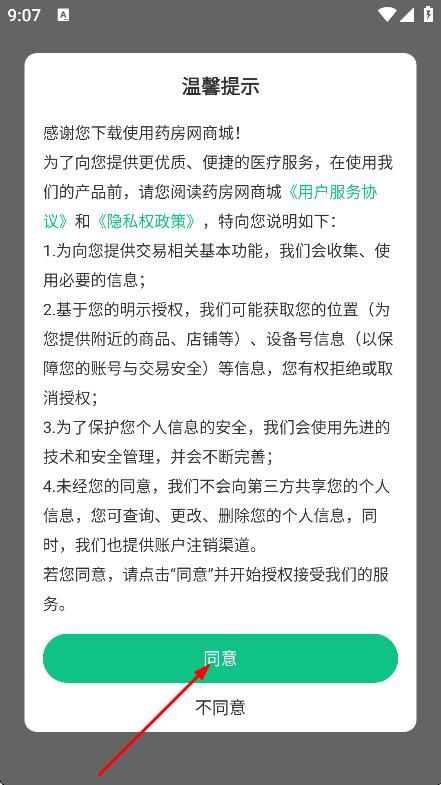 1、在溫馨提示彈窗中,點(diǎn)擊同意,進(jìn)入藥房網(wǎng)商城主頁面。