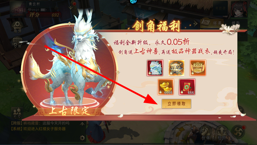 2、創(chuàng)角后,會(huì)有創(chuàng)角福利領(lǐng)取,其中包含上古神獸、極品神器戰(zhàn)衣等豐厚獎(jiǎng)勵(lì),點(diǎn)擊立即領(lǐng)取,這些福利能為前期冒險(xiǎn)提供強(qiáng)大助力。