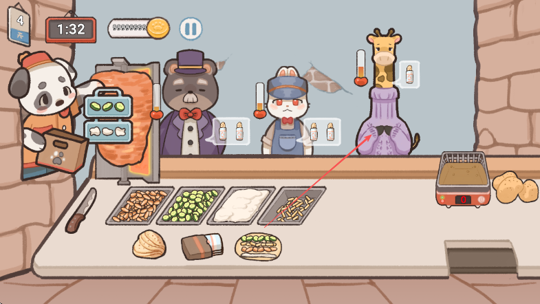 2、根據長頸鹿顧客需求,依次添加食材到面餅上制作食物,注意時間把控。