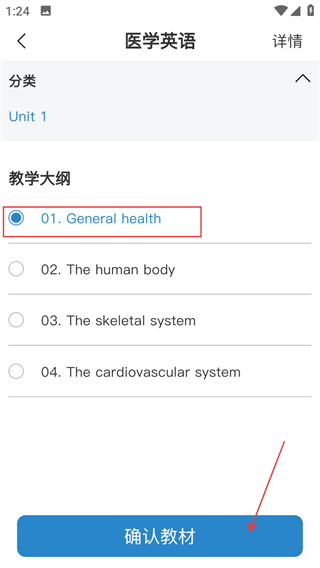 3、在課程頁面,選擇教學大綱內(nèi)容后,點擊確認教材。