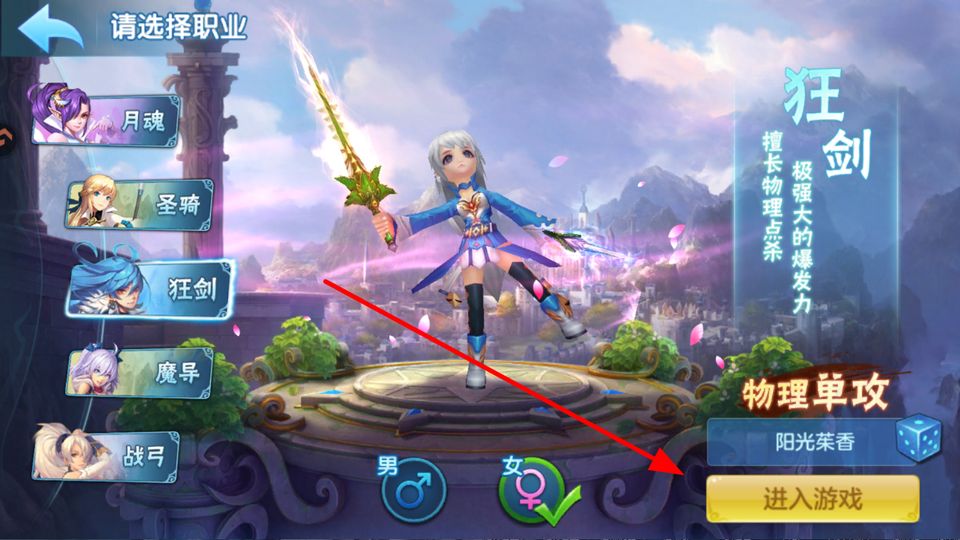 1、首先在職業(yè)選擇界面,挑選喜歡的職業(yè),像狂劍等,選好后點擊進入游戲,開啟在星辰奇緣的冒險之旅。