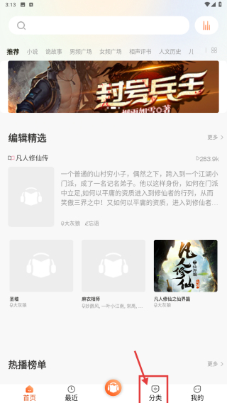 1、打開有聲讀物類應用,點擊底部分類選項,進入分類頁面。